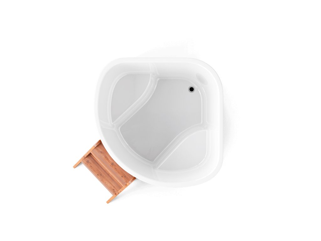 Ergonomický tvar kompozitního vnitřku koupací kádě CORNER 130 Cold Tub je vhodný pro osoby jakékoli výšky a konstituce. V případě venkovního použití se doporučuje instalovat volně stojící kamna POLARSPA.