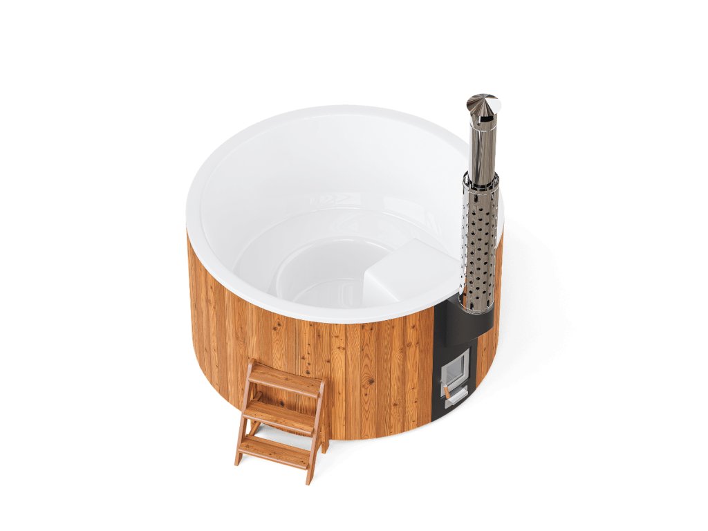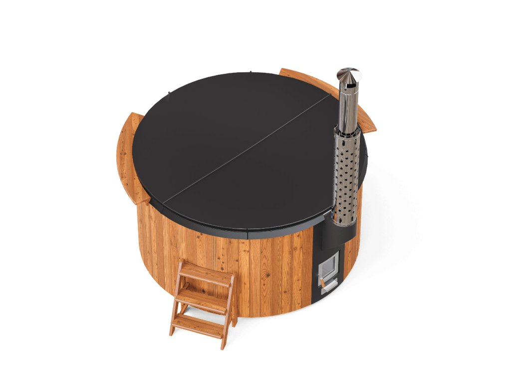 Koupací káď Elite 180 se dá používat venku za každého počasí. Nerezová kamna integrovaná do kádě rychle ohřívají vodu na příjemnou teplotu, za necelé dvě hodiny už můžete využívat všech předností vaší nové kádě. Svůdný oheň můžete sledovat skrz žáruvzdorné sklo instalované ve dvířkách kamen. Komín je chráněn speciálním nerezovým štítem, takže se nemůžete popálit. Kamna jsou elegantně integrována do vany a veškeré technické vybavení je skryto uvnitř.