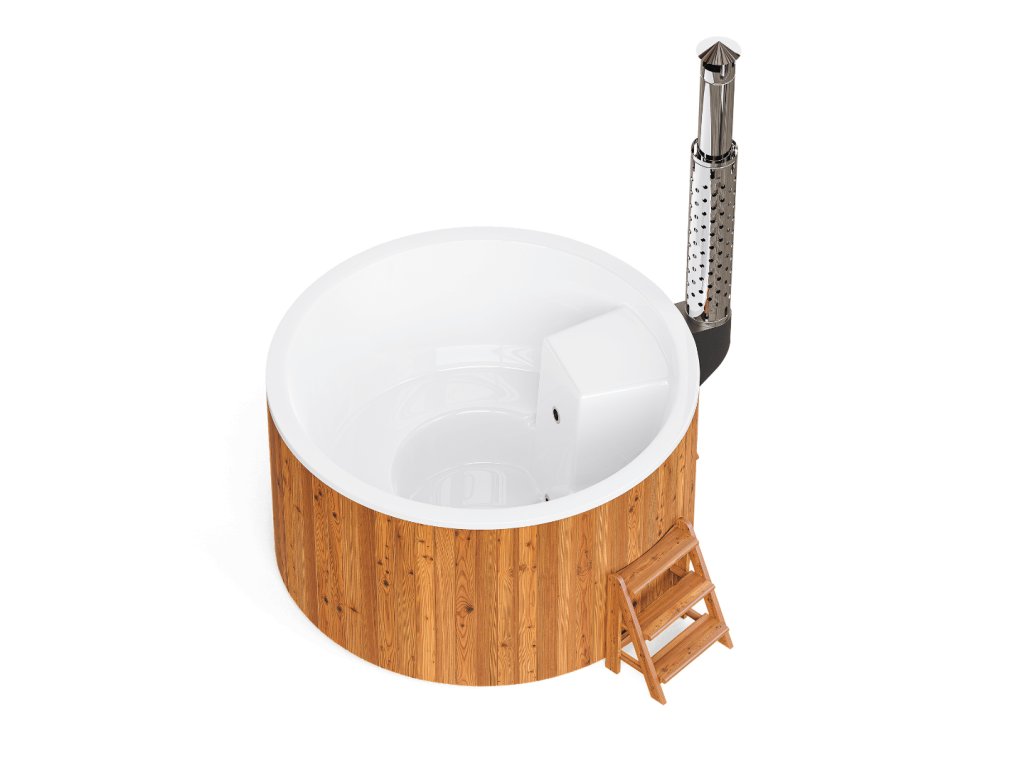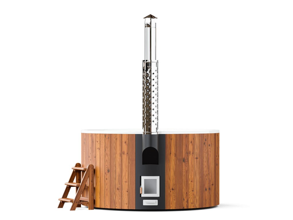 Koupací káď Elite 200 se dá používat venku za každého počasí. Nerezová kamna integrovaná do kádě rychle ohřívají vodu na příjemnou teplotu, za necelé dvě hodiny už můžete využívat všech předností vaší nové kádě. Svůdný oheň můžete sledovat skrz žáruvzdorné sklo instalované ve dvířkách kamen. Komín je chráněn speciálním nerezovým štítem, takže se nemůžete popálit. Kamna jsou elegantně integrována do vany a veškeré technické vybavení je skryto uvnitř.