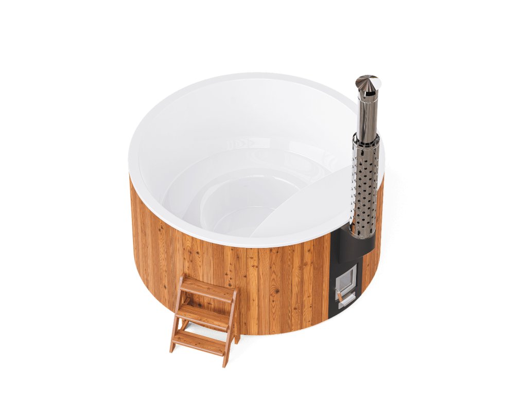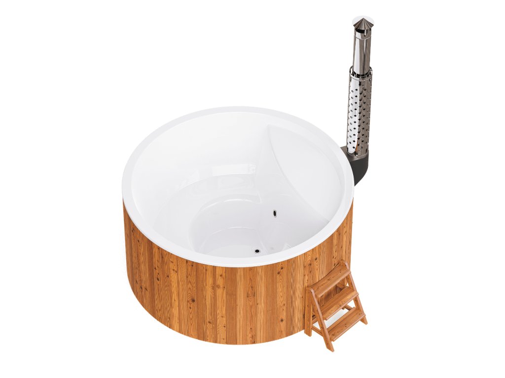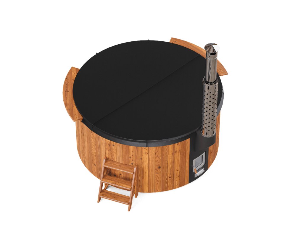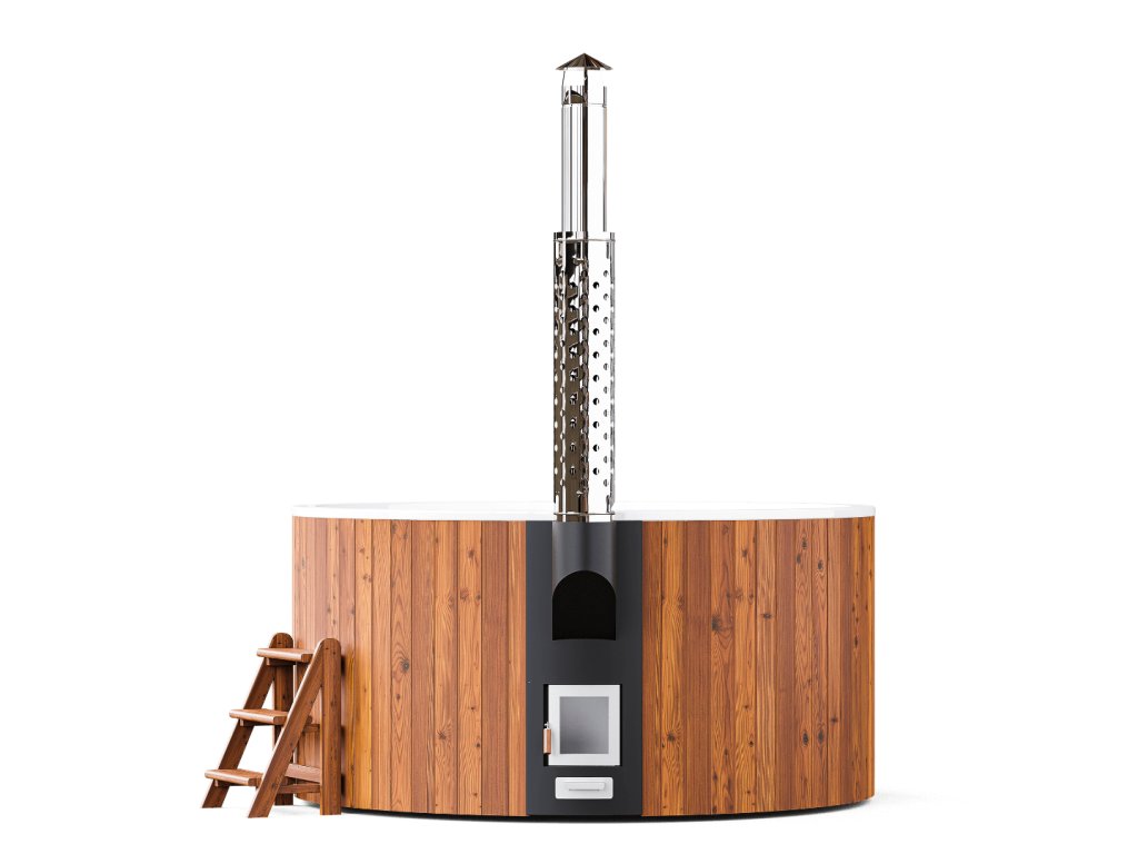 Koupací káď se dá používat venku za každého počasí. Nerezová kamna integrovaná do kádě rychle ohřívají vodu na příjemnou teplotu, za necelé dvě hodiny už můžete využívat všech předností vaší nové kádě. Svůdný oheň můžete sledovat skrz žáruvzdorné sklo instalované ve dvířkách kamen. Komín je chráněn speciálním nerezovým štítem, takže se nemůžete popálit. Kamna jsou elegantně integrována do vany a veškeré technické vybavení je skryto uvnitř.