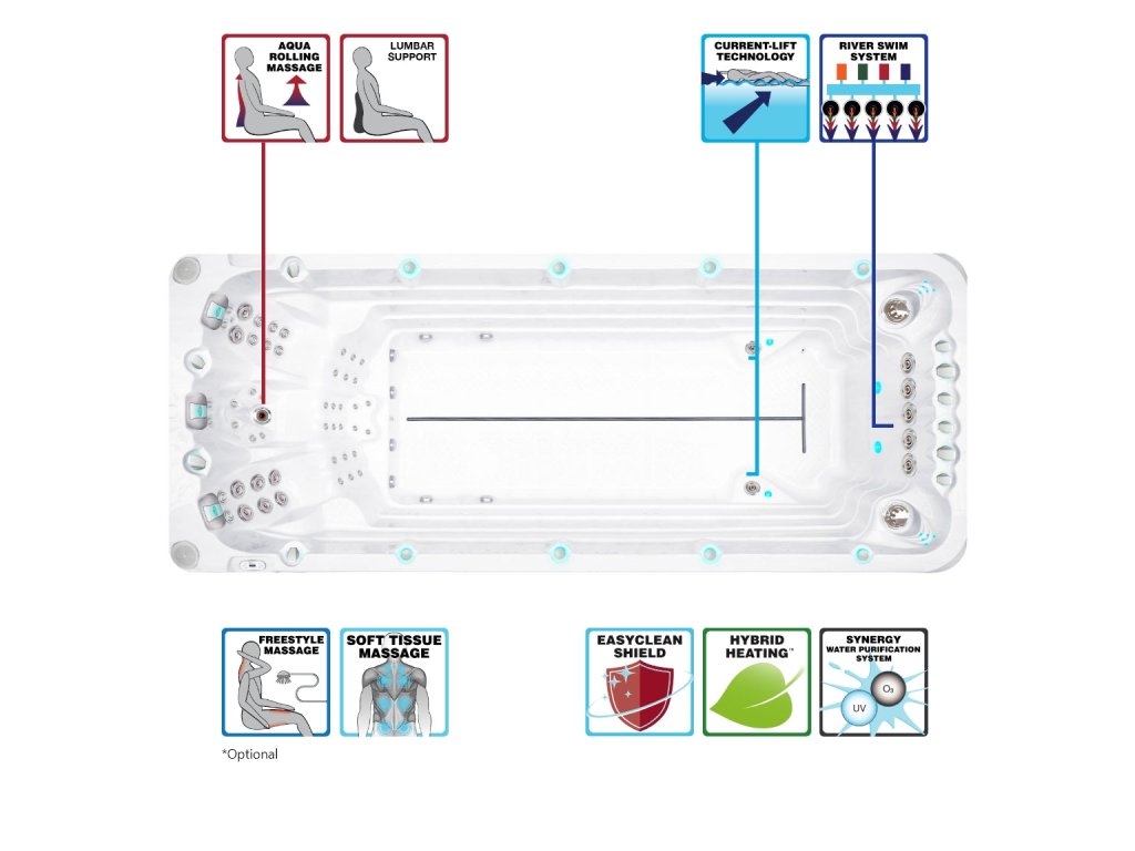 Jedná se o unikátní lineární umístění pěti silných protiproudých trysek, které vytváří příjemný a konstantní protiproud v celé šířce bazénové části. Tlak vody je vždy směřován do všech trysek protiproudu, kdy zapínáním jednotlivých čerpadel zvyšujete intenzitu protiproudu ve všech tryskách najednou. Toto je oproti konkurenci revoluční řešení protiproudu, které umožňuje jednoduché plavání začátečníkům a méně pokročilým plavcům. Díky tomuto řešení je protiproud široký a efektivně proudí těsně pod hladinou vody, což umožňuje pohodlné plavání s hlavou nad hladinou. I v takto krátké vířivce s protiproudem můžete opravdu plnohodnotně plavat.