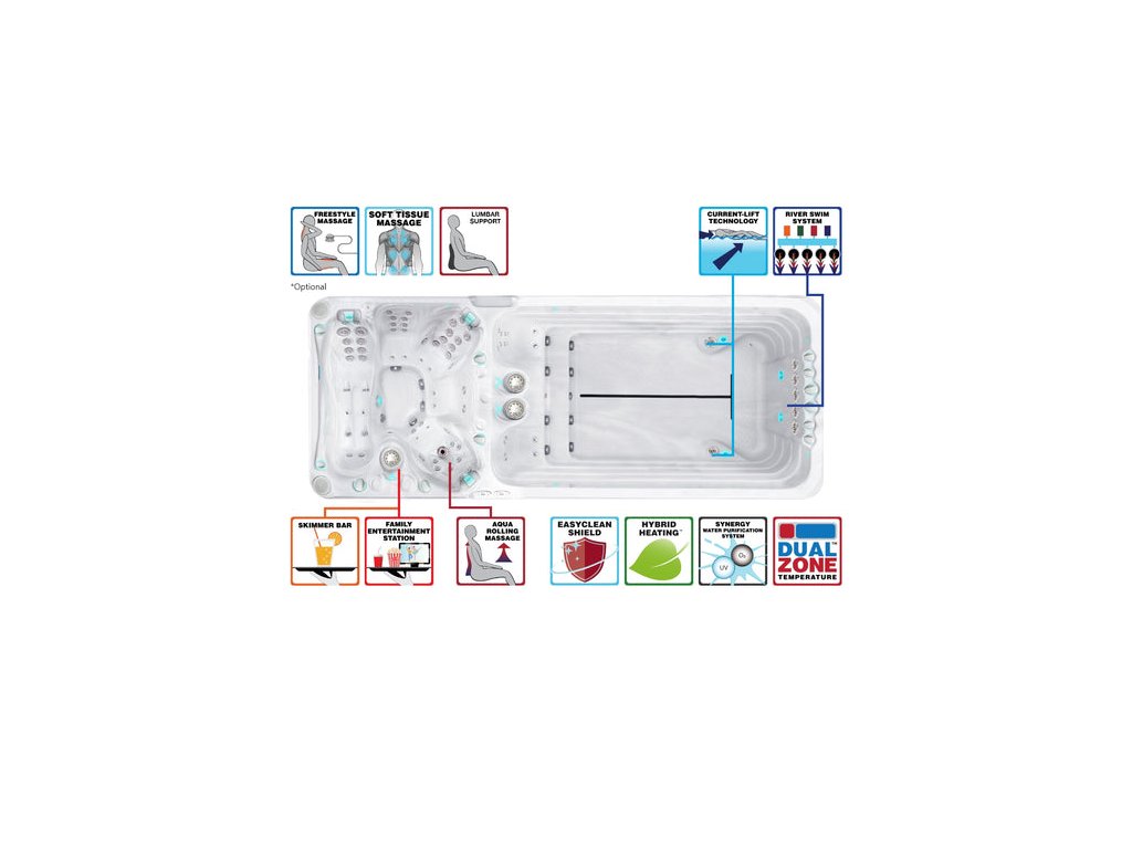 Samozřejmě je tato swim spa vybavena efektivním systémem Current-lift Technology™, který známe ze všech Fitness modelů výrobce Passion Spas. Tato technologie umožňuje příjemné dávkování tréninkových porcí ovládáním intenzity protiproudu a tudíž přidáváním intenzity spodních trysek v dolní přední části swim spy, které nadnáší plavce při odpočinkové fázi.
