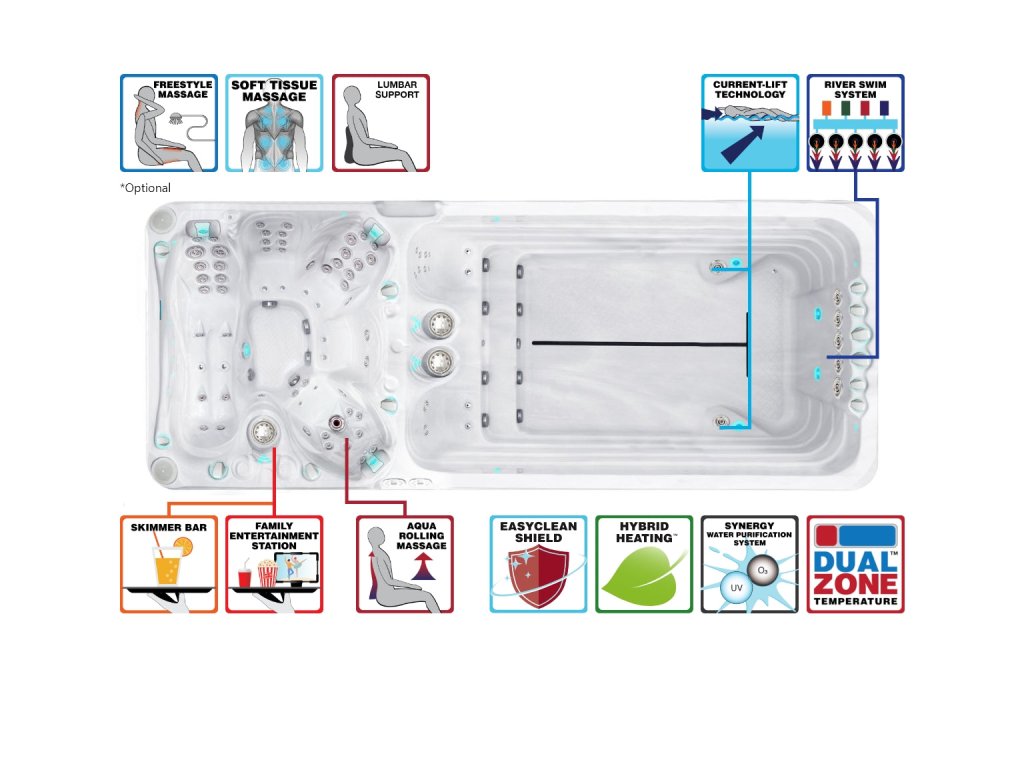 Samozřejmě je tato swim spa vybavena efektivním systémem Current-lift Technology™, který známe ze všech Fitness modelů výrobce Passion Spas. Tato technologie umožňuje příjemné dávkování tréninkových porcí ovládáním intenzity protiproudu a tudíž přidáváním intenzity spodních trysek v dolní přední části swim spy, které nadnáší plavce při odpočinkové fázi.