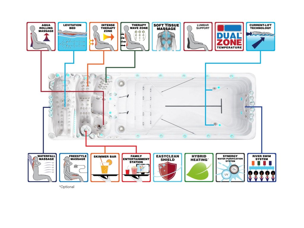 Tato vířivka s protiproudem od Passion Spas - model ENERGY DEEP je vysoce moderním (nebojíme se říct, že společně s modelovou řadou Spirit nejmodernějším) typem Swim Spa na světě, která kombinuje protiproudovou Lift-technologii kolekce Fitness s těmi nejinovativnějšími spa masážními technikami, které kdy byly vyrobeny. Poskytuje tak jedinečné spojení Aqua Rolling Massage™, Intense Therapy Zone™ a Therapy Wave Zone™ pro dokonalou relaxaci a zážitek z wellness a hydroterapie. Exkluzivní záležitostí je speciální pozice Levitation bedTM, designovaná pro nejlepší vířivky Passion Spas