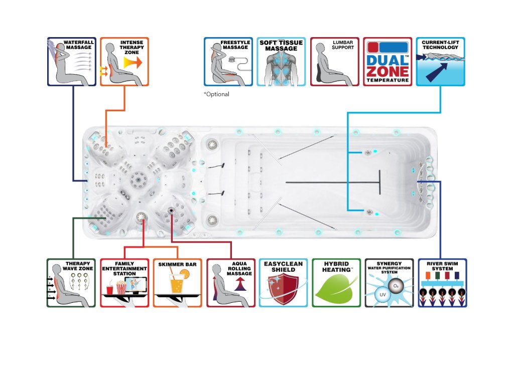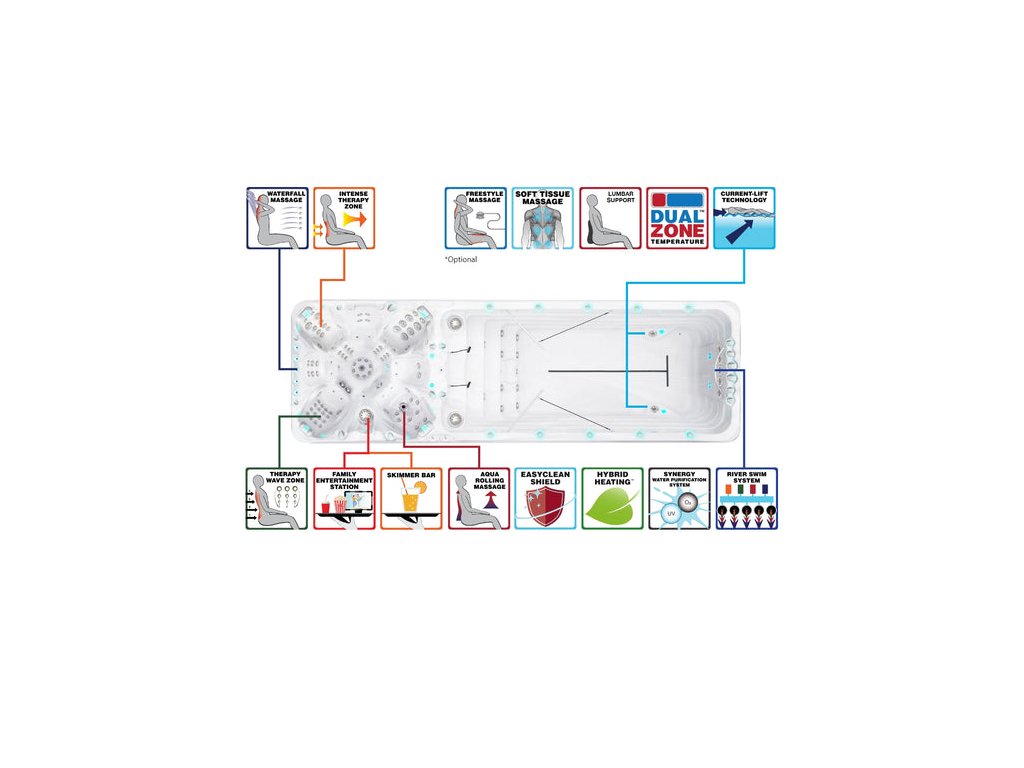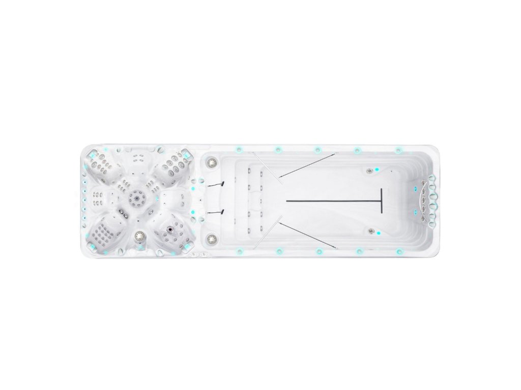 Samozřejmě je tato swim spa vybavena efektivním systémem Current-lift Technology™, který známe ze všech Fitness modelů výrobce Passion Spas. Tato technologie umožňuje příjemné dávkování tréninkových porcí ovládáním intenzity protiproudu a tudíž přidáváním intenzity spodních trysek v dolní přední části swim spy, které nadnáší plavce při odpočinkové fázi.