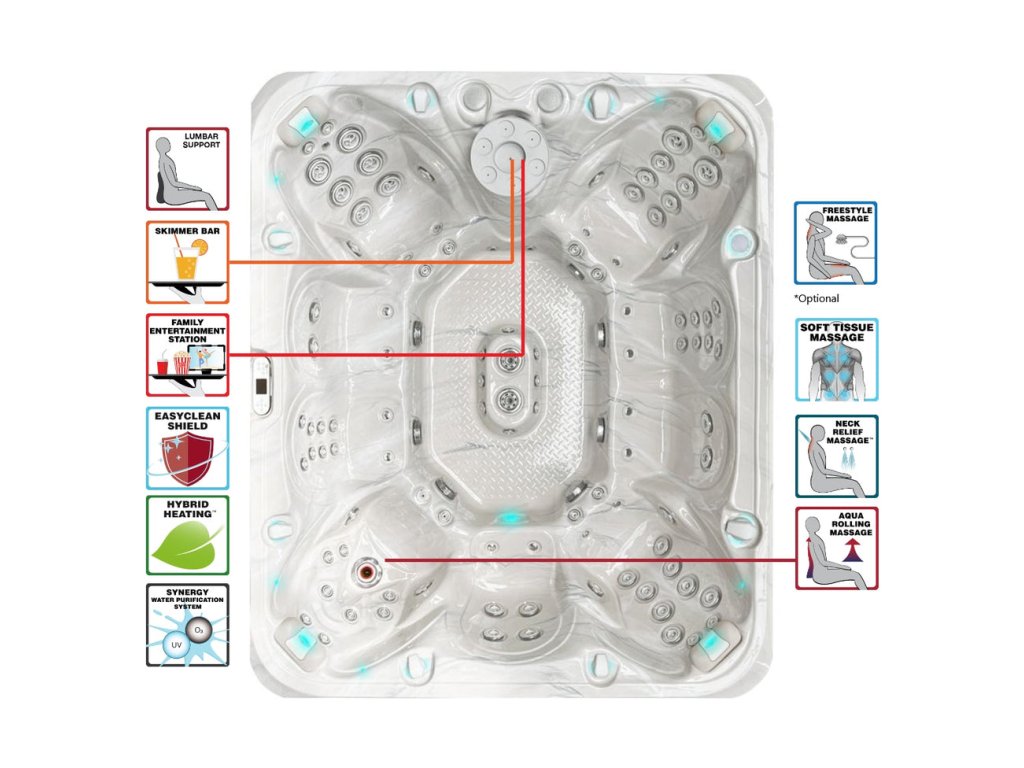 Všechny vířivky Passion Spas jsou vybaveny Hybrid HeatingTM technologií. Jedná se o kombinaci třístupňové izolace (pěnový nástřik, hliníková vzduchová folie, izolace bočních panelů), Heat Lock systému (silný pochozí termokryt, EverlastTM dna vířivky, třístupňová izolace) a Eco Energy systému (hybridní filtrační čerpadlo, programovatelné ovládání) |