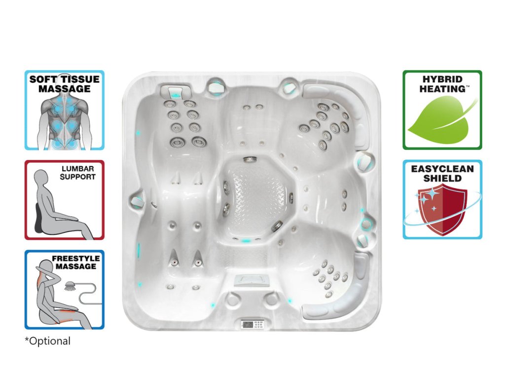 Všechny vířivky Passion Spas jsou vybaveny Hybrid HeatingTM technologií. Jedná se o kombinaci třístupňové izolace (pěnový nástřik, hliníková vzduchová folie, izolace bočních panelů), Heat Lock systému (silný pochozí termokryt, EverlastTM dna vířivky, třístupňová izolace) a Eco Energy systému (hybridní filtrační čerpadlo, programovatelné ovládání) |