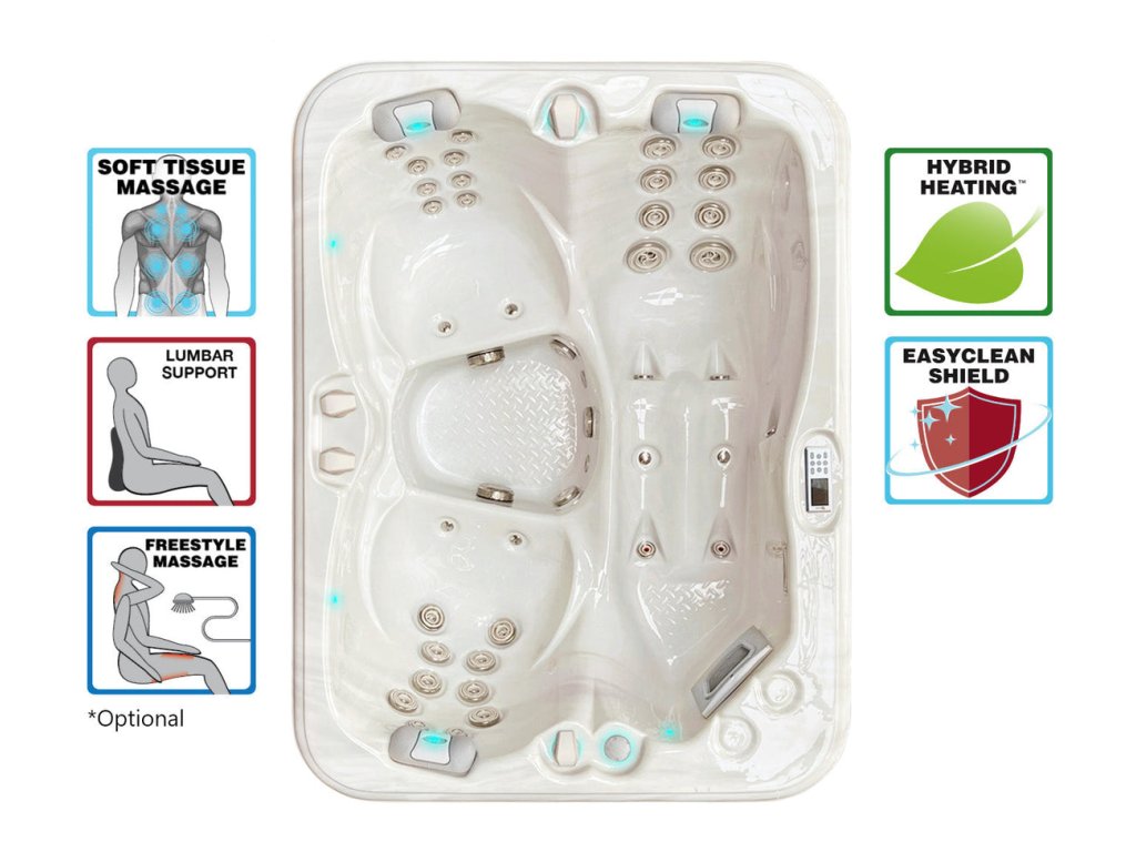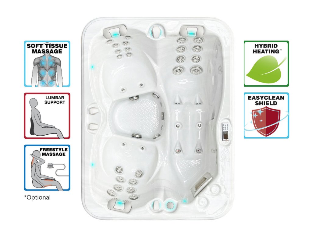 Všechny vířivky Passion Spas jsou vybaveny Hybrid HeatingTM technologií. Jedná se o kombinaci třístupňové izolace (pěnový nástřik, hliníková vzduchová folie, izolace bočních panelů), Heat Lock systému (silný pochozí termokryt, EverlastTM dna vířivky, třístupňová izolace) a Eco Energy systému (hybridní filtrační čerpadlo, programovatelné ovládání) |