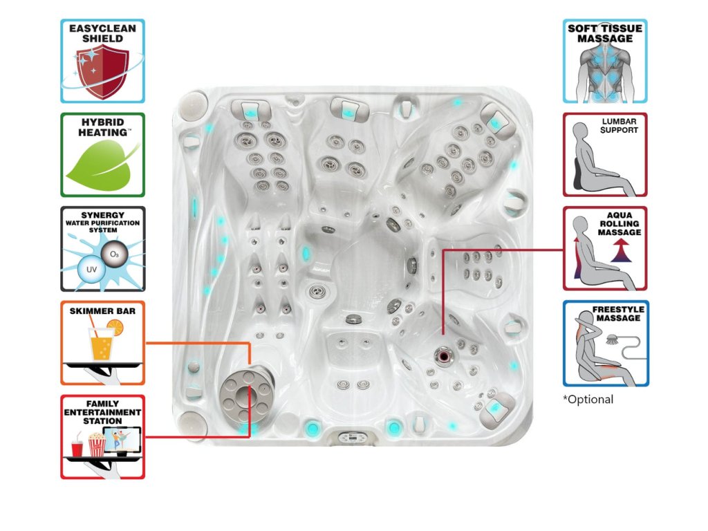 Standartní Passion Spas výbava zahrnuje jemnou vzduchovou masáž, StarBriteTM LED osvětlení a systém aromaterapie. Signature Collection je vybavena Bluetooth audio systémem s integrovanými reproduktory ve skořepině.