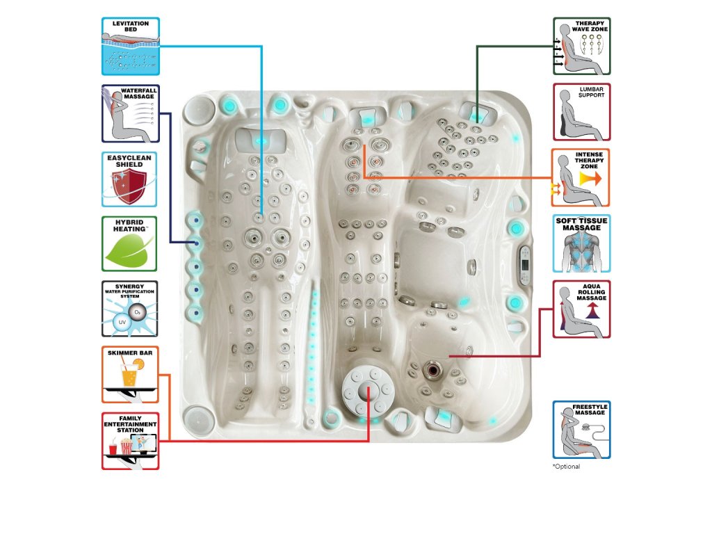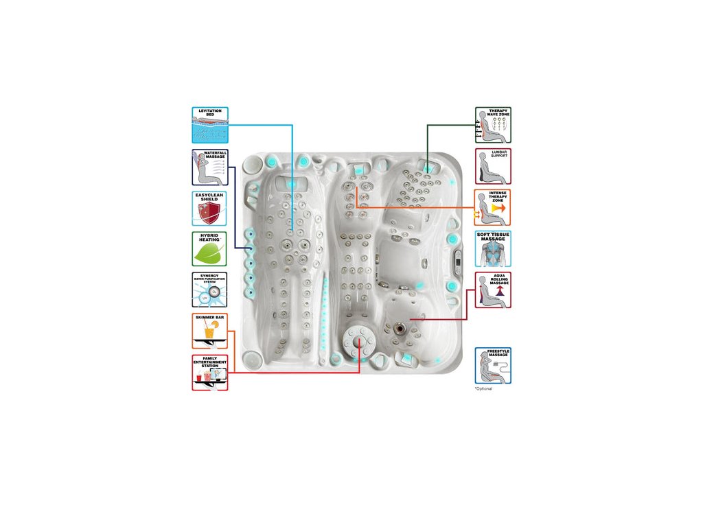 Každá Passion Spa má řadu masážních funkcí, které vám přinesou dokonalý terapeutický zážitek. Díky letitým zkušenostem a spolupráci s fyzioterapeuty jsme vyvinuli jedinečné masážní systémy, jako je např. Aqua Rolling Massage™, Intense Therapy Zone™, Therapy Wave Zone™, Levitation Bed™ či Waterfall Massage™. Vše je podpořeno promyšlenými hydromasážními rozvody, kdy si můžete velmi jednoduše a efektivně řídit sílu masáže v jednotlivých pozicích.