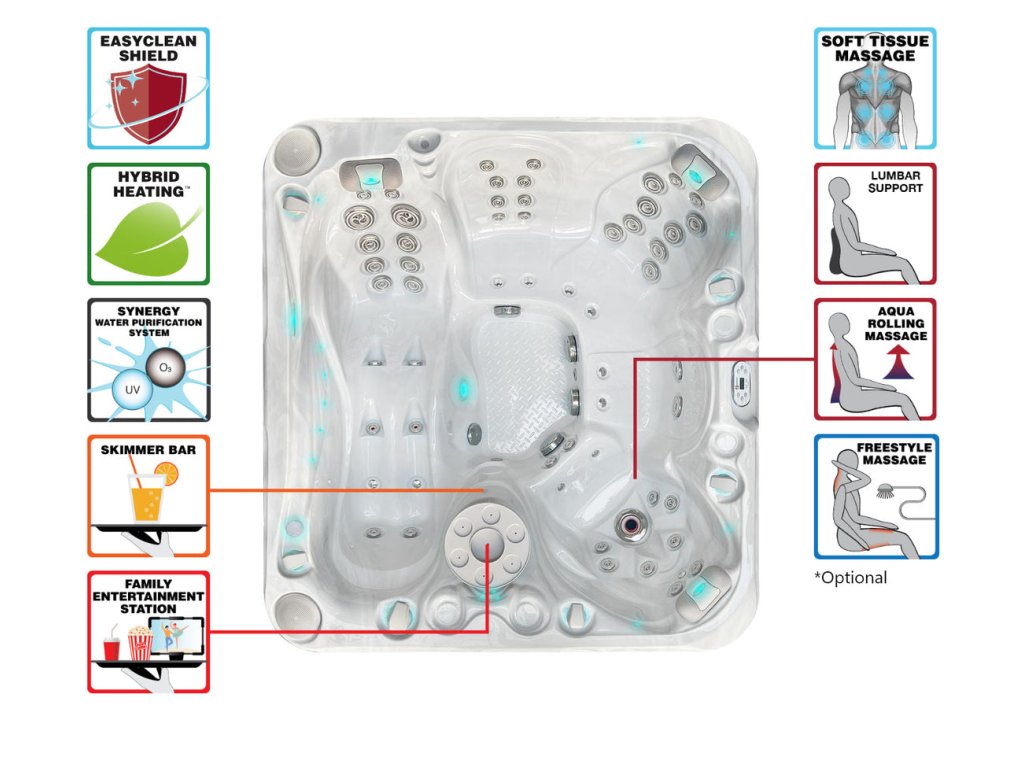 Tato plně vybavená vířivka je vyrobena v duchu umění, má programovatelné ovládání, 58 hydromasážních trysek a náš exkluzivní Aqua Rolling MassageTM systém, který zajistí povzbuzující zážitek.