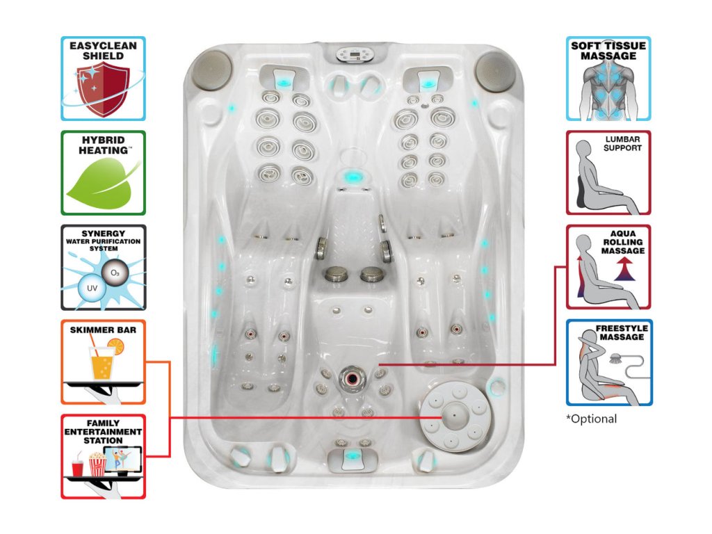 Standartní Passion Spas výbava zahrnuje jemnou vzduchovou masáž, StarBriteTM LED interní i vnější osvětlení a systém aromaterapie. Signature Collection je vybavena Bluetooth audio systémem s integrovanými reproduktory ve skořepině.